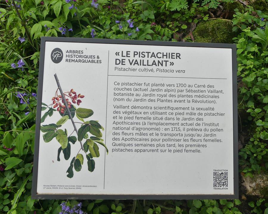 Les arbres historiques font la richesse du jardin des Plantes. Classé "arbre remarquable", le pistachier, dit de Vaillant, n'est pas la moindre des curiosités. C'est grâce à lui que le naturaliste, Sébastien Vaillant (+ 1722) a mis en lumière la sexualité du règne végétal, ce qui fit scandale à l'époque.